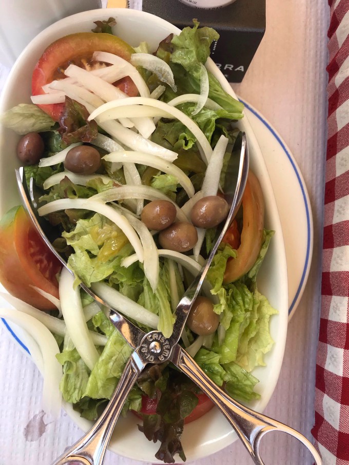 Salad served immediately upon sitting down along with bread and olives,