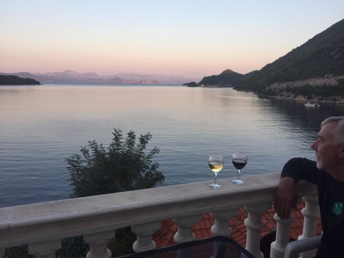 Having wine on our balcony: nice digs, nice view, good company and only $45 a night….