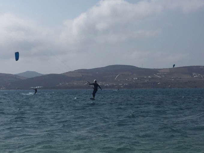 Paros was as windy as Mykonos and I quickly found a kite shop that was open and offered rentals! ๐Ÿ˜ƒ๐Ÿ˜ƒ๐Ÿ˜ƒ Terri knew I was longing to get out on the water and she encouraged me to go and even offered to be my photographer. The shop was well set-up with lots of good gear and the owner even loaned me his foil board towards the end of my session. In all, I had a great time and Terri caught up in her emails and reading for the nearly three hours I was on the water.