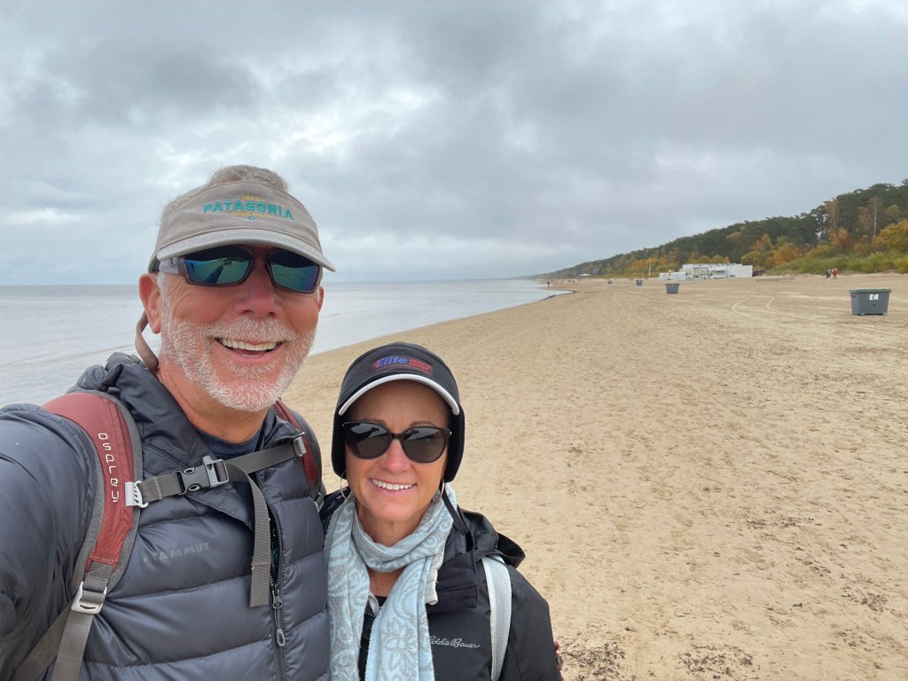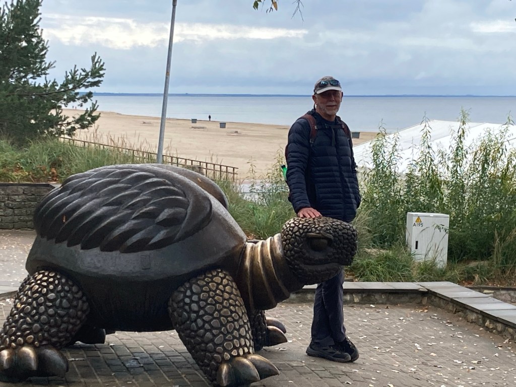 A warm day on a Latvian beach in October, hope we can find a spot! We both dipped our fingers in the Baltic. Cold. In a drizzly rain!