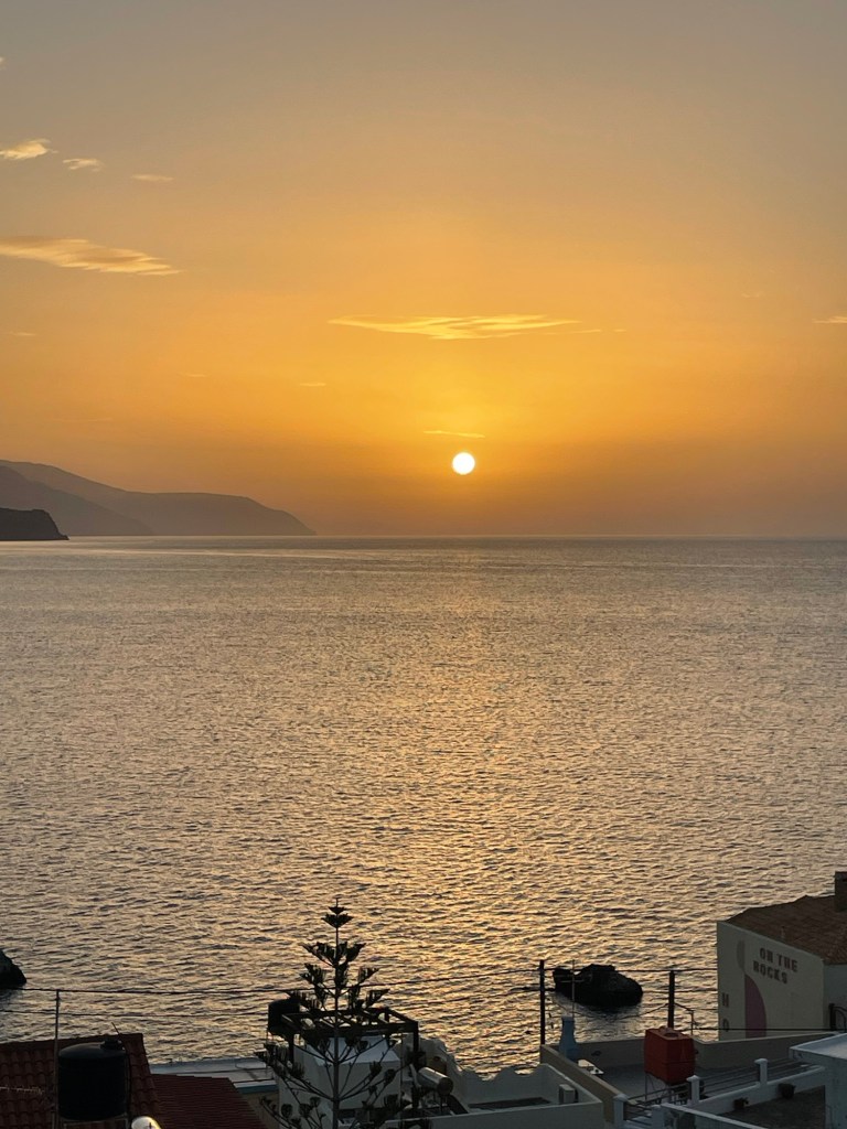 Sunrise in Paleochora, from the fortress. Our hotel is the one in the bottom right, On The Rocks