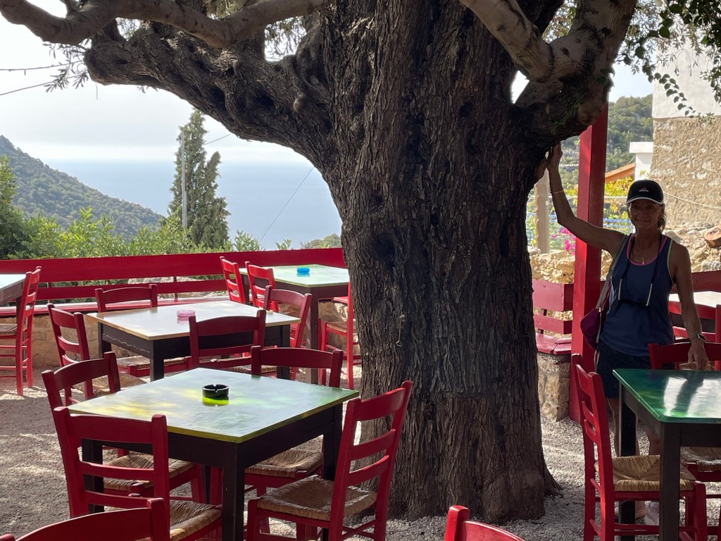 Terri supporting a 400 year old olive tree in Anidri at the Old School House Cafe, a cross roads for hot, tired, sweaty hikers and a couple of locals