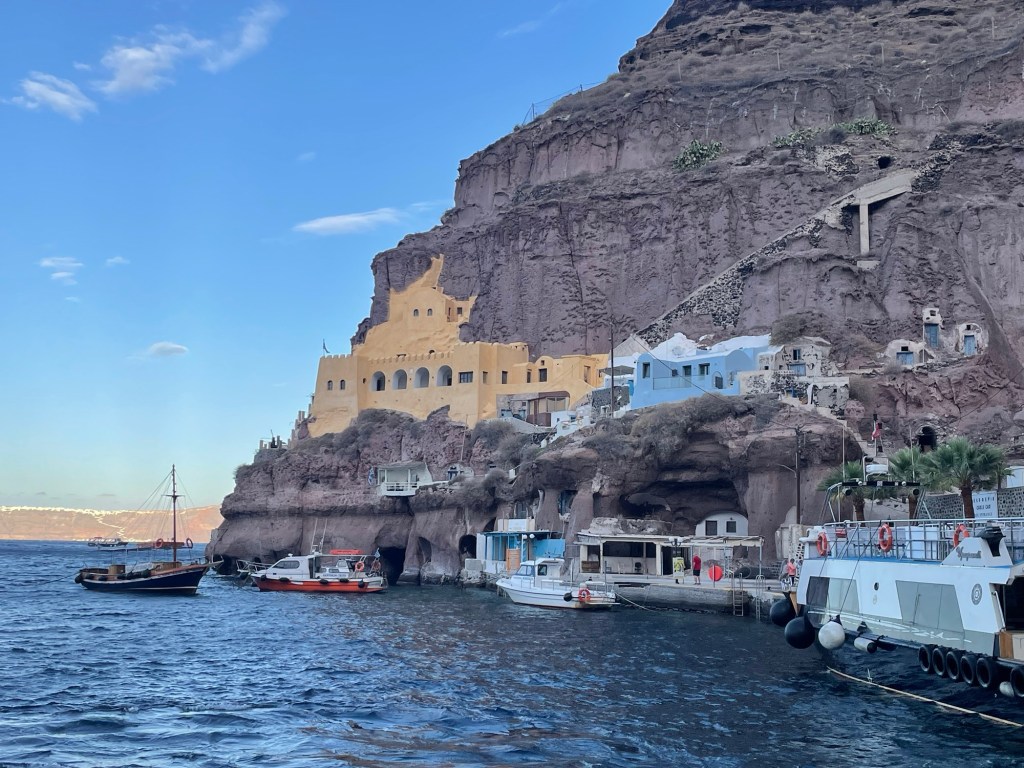 Coming into Santorini at sunrise by boat is spectacular. It’s a beautiful island with steep cliffs topped by the iconic white Greek homes.