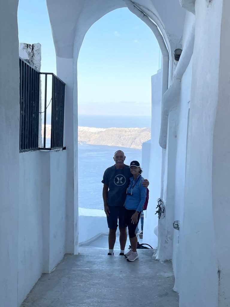 After the 600 plus steps and 700+ feet of elevation gain, we were in the city of Fira. We had already discovered that Joe & Suzanne were not of the “shopper” type, so like us there plan was a hike to the next “big” town on Santorini, Oia.