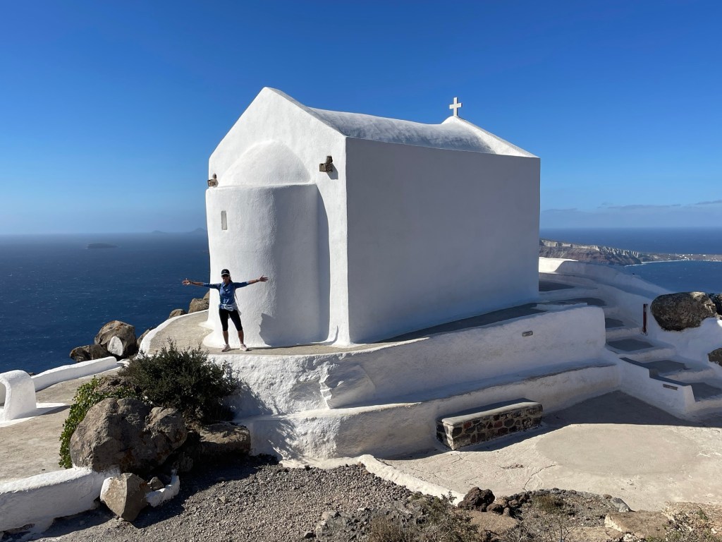 Terri feeling happy and relieved after Hotel Nobu, showing appreciation at one of the many beautiful but bathroom-less Greek Chapels found everywhere in Greece.