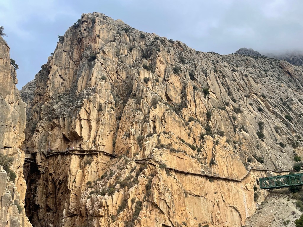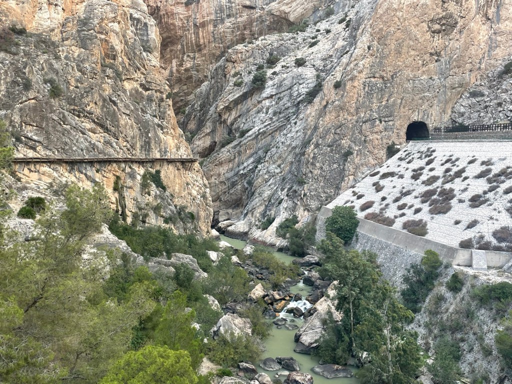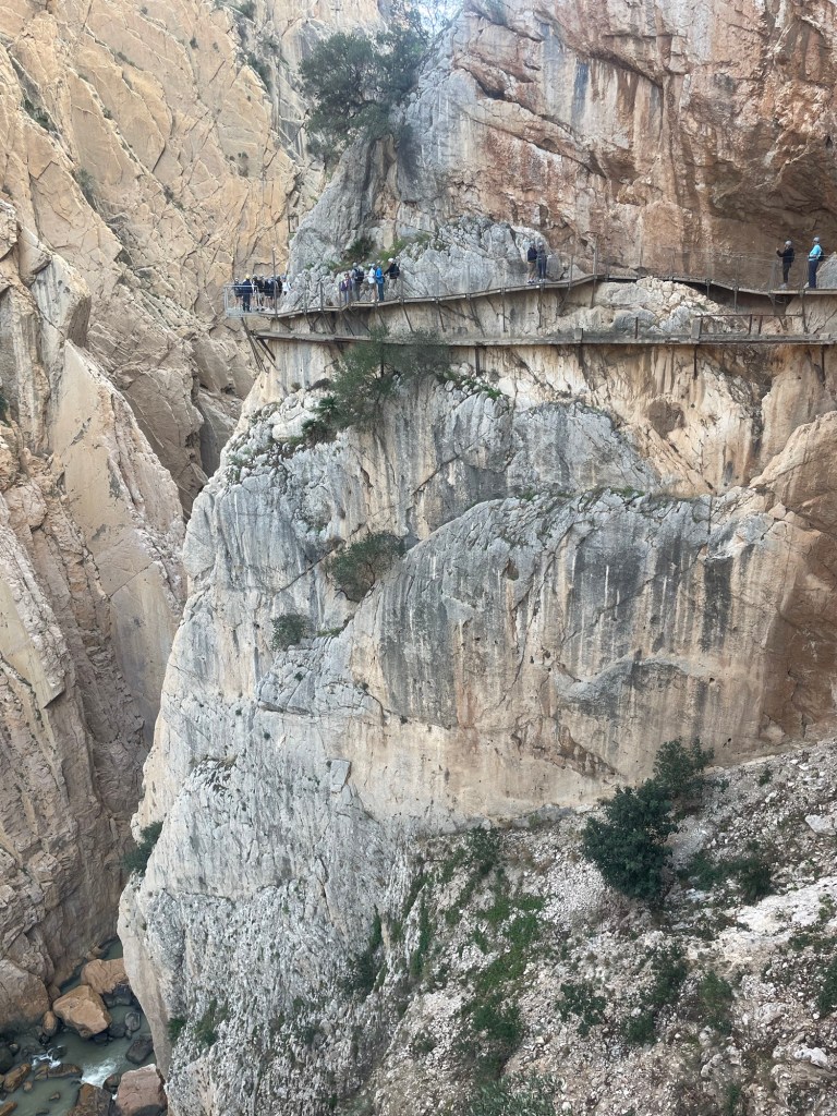The hike, Caminito del Rey, is about 5 miles long and not difficult from an endurance point of view but a few people needed help in crossing the areas that were high above whatever was below. You are required to wear a helmet because of rock falls from above, although I’m not sure what help they would provide unless the falling rock was the size of a marble or less.