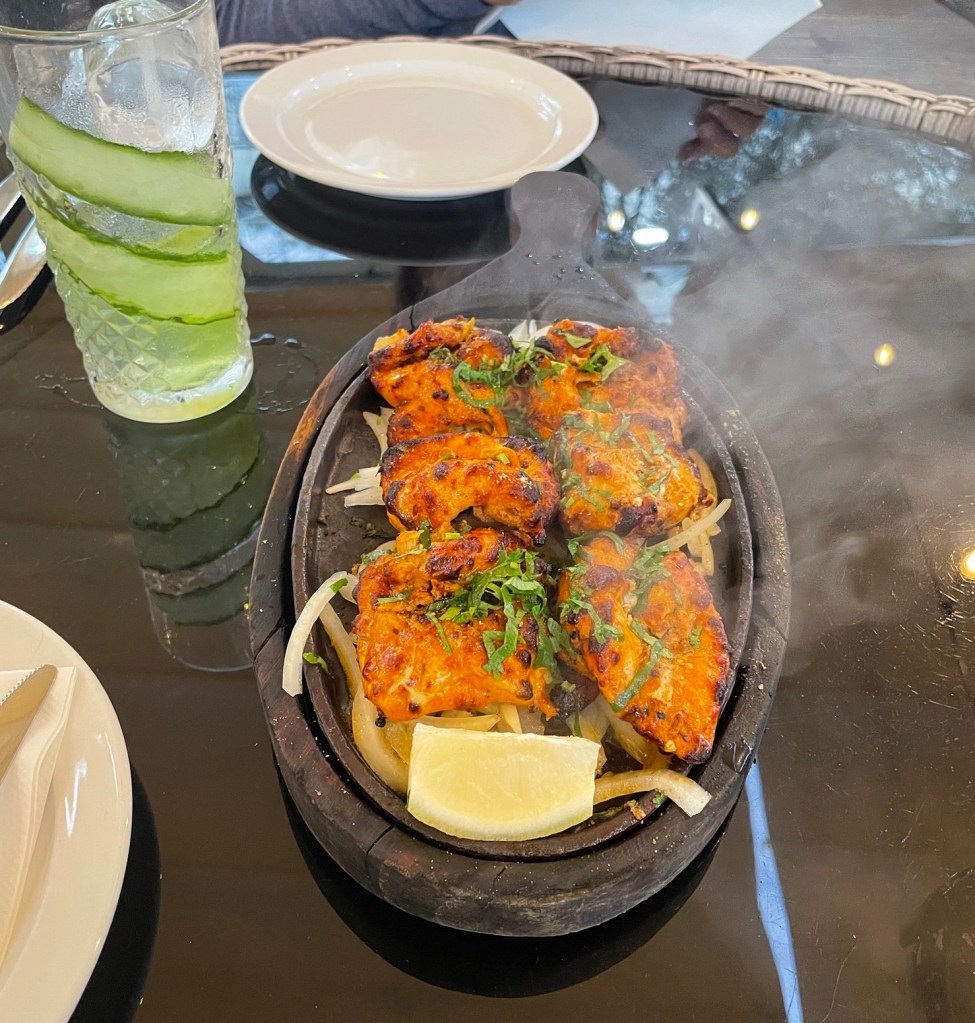 Not wanting to see the full extent of British cooking on unsuspecting vegetables, Terri found an Indian restaurant for dinner. Tandoori chicken anyone? The spicy naan with garlic was amazing.