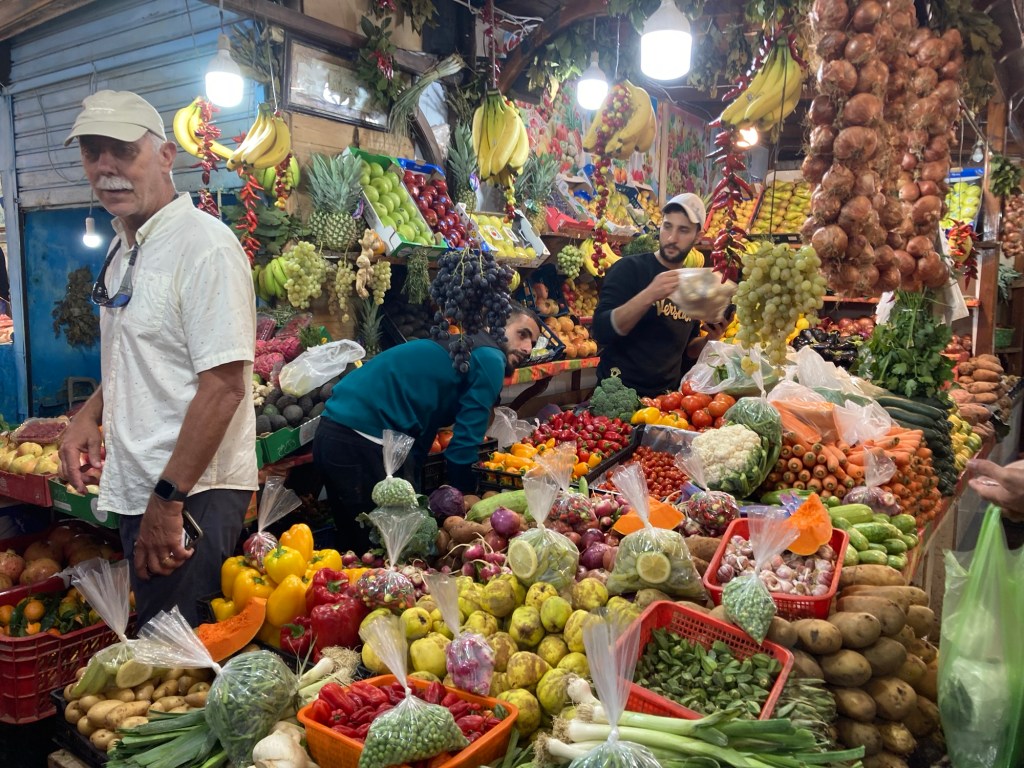 Terri and Mohammed watching the olive stand with Mohammed explaining the types of olives. 🫒