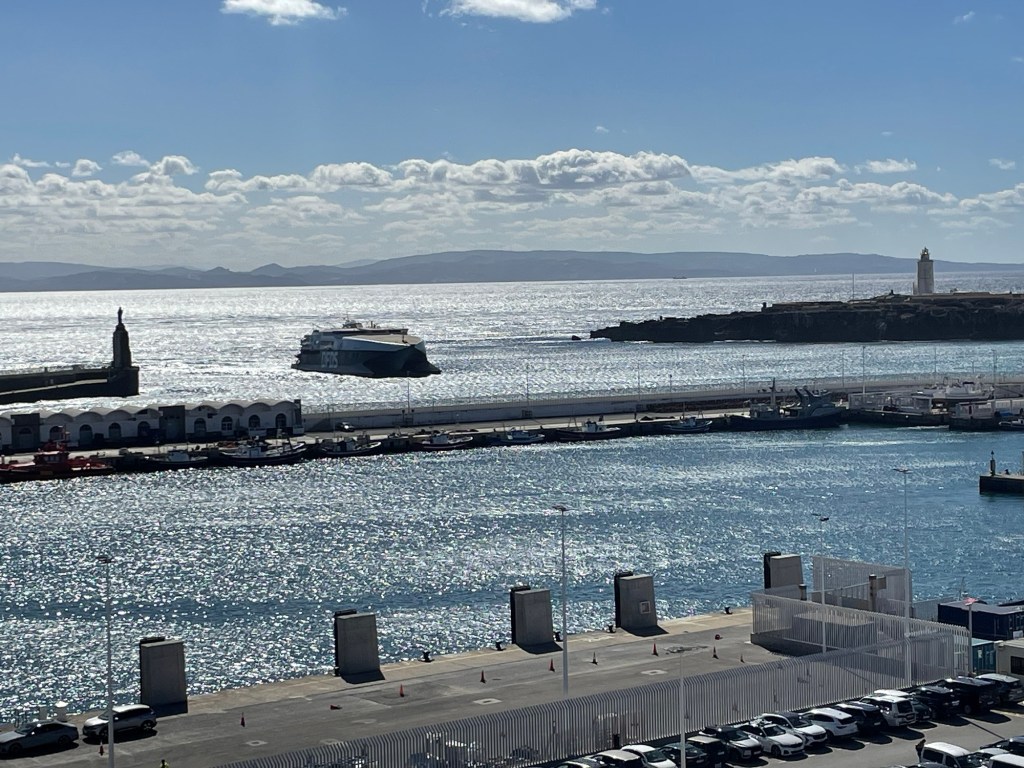 One of the ferries that goes to Tangier with North Africa in the background