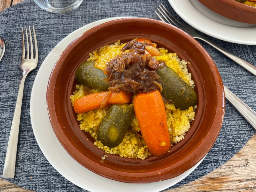 Saffron couscous with carrots, squash and chicken. No beer in the picture or the restaurant, 98% Muslim in Tangier. A Coke please!